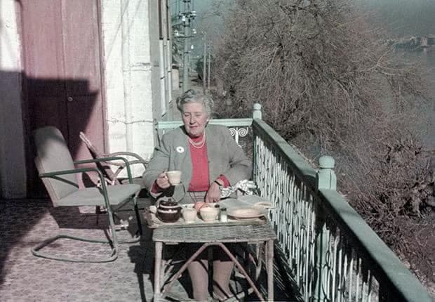 Agatha Christie enjoying tea on the balcony of the British School of Archaeology in Iraq, Baghdad, 1950s. Christie’s second husband, Sir Max Mallowan was a prominent archaeologist, and Christie spent plenty of time travelling with him and digging up ancient Mesopotamian artefacts.
